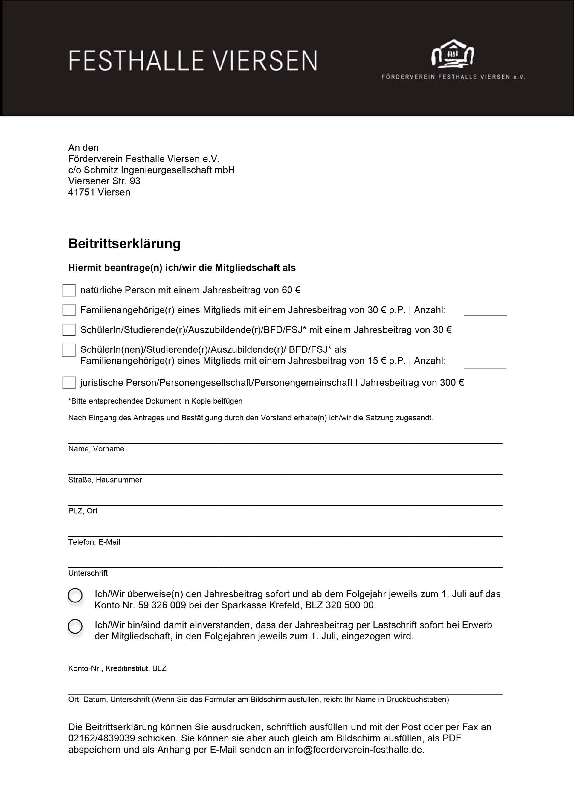 Hier finden Sie Ihr Spendenformular und Ihre Beitrittserklärung als PDF: Ausdrucken, schriftlich ausfüllen und mit der Post an den Förderverein Festhalle Viersen e.V., c/o Schmitz Ingenieurgesellschaft mbH, Viersener Str. 93, 41751 Viersen oder per Fax an 0 21 62 / 4 83 90 39 schicken. Sie können sie aber auch gleich am Bildschirm ausfüllen, als PDF abspeichern und als Anhang per E-Mail senden an info@foerderverein-festhalle.de.